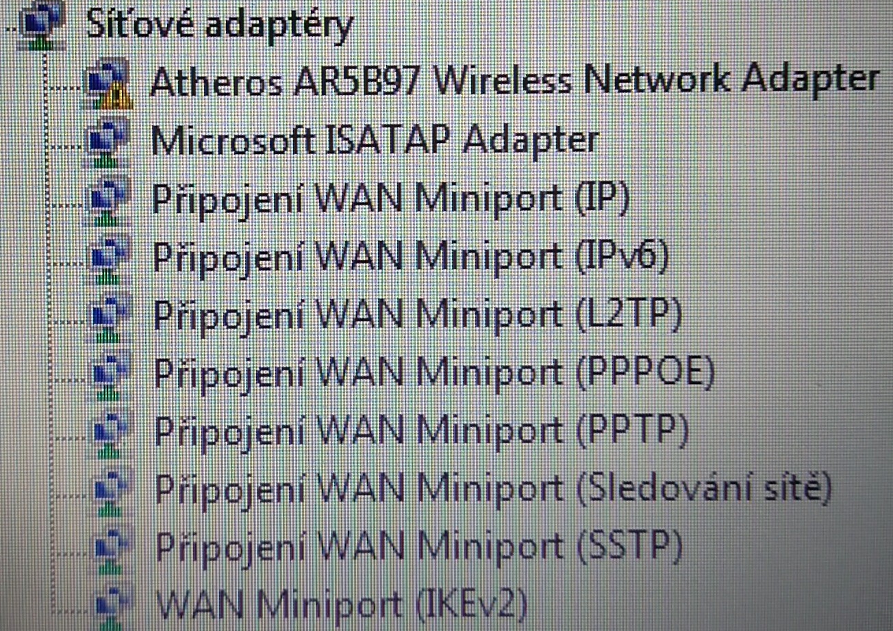 V systému není síťová karta. Jediný regulérní atheros má žlutý vykřičník.