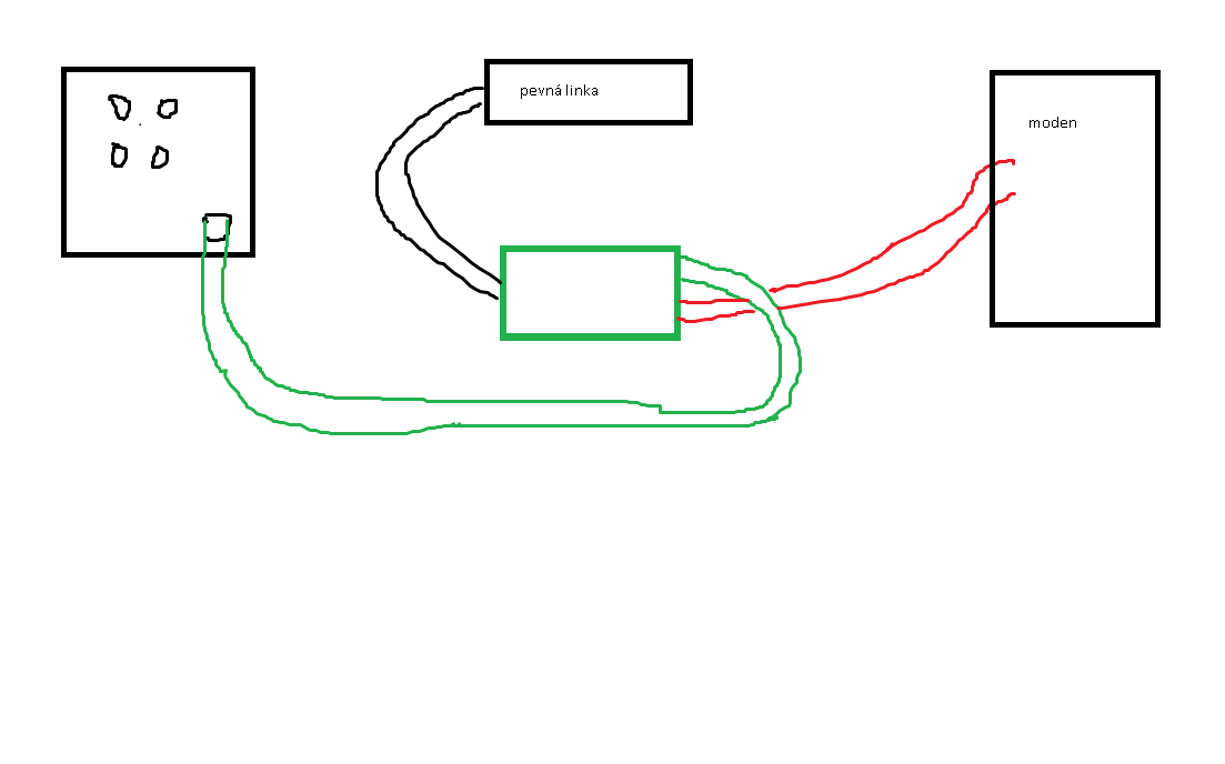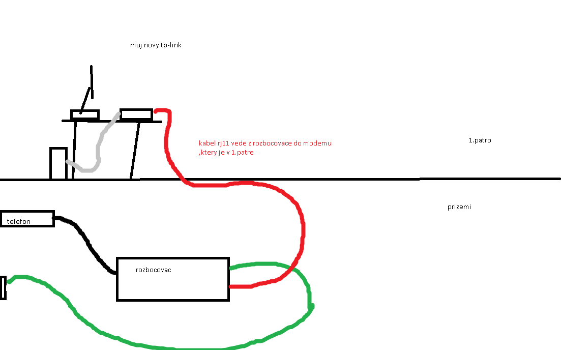 Kde máš telefon? Taky by si mohl všechno hodit nahoru, a natáhnout to tam přes RJ-11. Pokud by ti babička odpouje ten splitter, nebo co to je, tak přicházíš i o telefonní spojení. O tom víš?