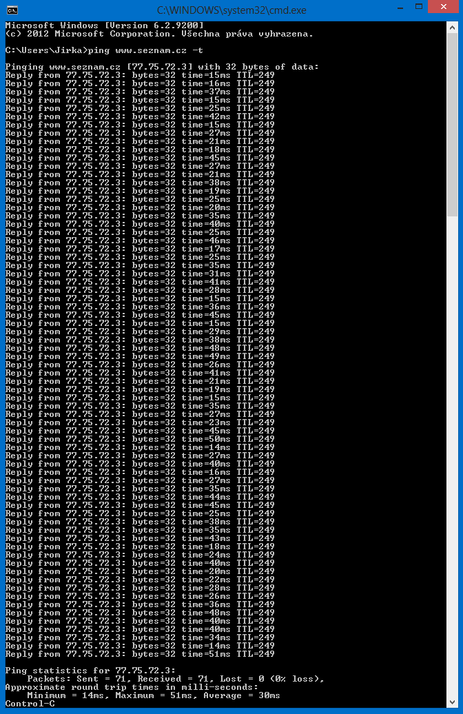 Pak poveď ještě příkaz tracert www.seznam.cz a z toho sem dej taky screen. (pokuď nenaměří vys. ping, tak opakuj)