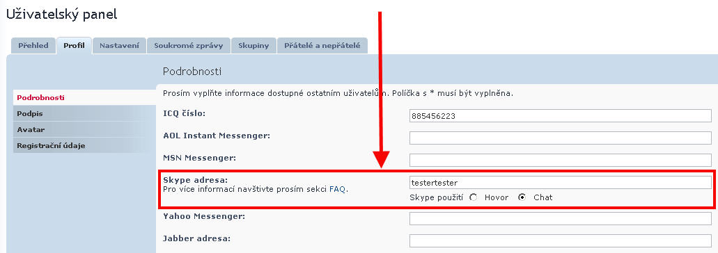 - adresu vašeho Skype zadáte do políčka Skype ve vašem profilu (poté se automaticky začne zobrazovat všem ostatním, registrovaným uživatelům), ve svém profilu rovněž určíte, zda-li se má v tématu po kliknutí na ikonku Skype spustit Hovor nebo Chat
