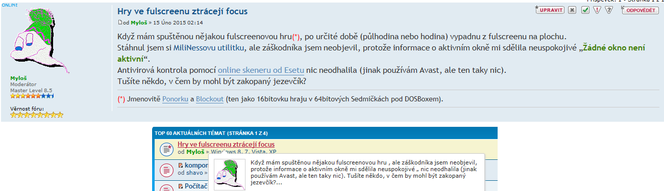 - Nesnažte se řešit jiný problém (i když podobný) v jednom tématu. Raději založte nové téma.