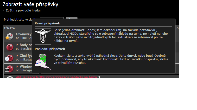 Myloš píše:Koukám, že to z textu vybírá náhodná slova:Je to úmysl, nebo bug? Osobně bych preferoval, aby to ukazovalo kontinuální text od začátku příspěvku, klidně ve stávajícím rozsahu.