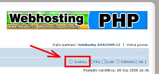 - zatím jsem neumístnil LINK na hlavní stránku fóra, MOD je čerstvě nainstalovaný a ještě ho musíme přeložit - předpokládám, že do neděle 3.8. by mohlo být hotovo. Sudoku je přístupné přes tento odkaz.