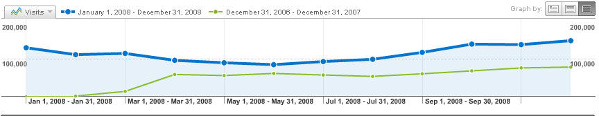 Jedním z našich cílů bylo i v roce 2008 navýšit návštěvnost o dvojnásobek předchozího období. Tohle se téměř podařilo naplnit a dosáhli jsme skvělého výsledku - nárůst o 80%. Níže naleznete několik grafů a zajímavých statistik.
