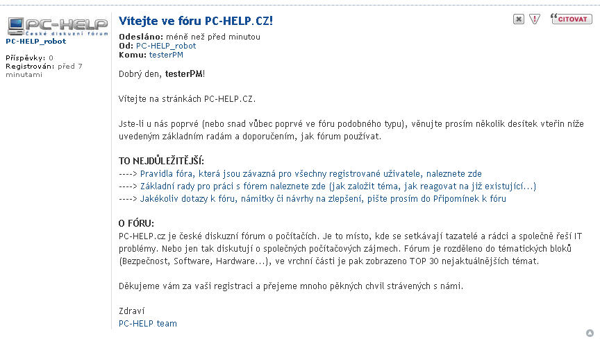 Implementovali jsme do fóra MOD pro automatické zasílání uvítací SZ. Ta se pošle všem nově registrovaným uživatelům a obsahuje základní informace o fóru. Věřím, že tímto krokem pomůžeme našim "nováčkům" se ve fóru snáze zorientovat. Náhled na uvítací SZ viz. níže uvedený obrázek (text se samozřejmě může do budoucna změnit).