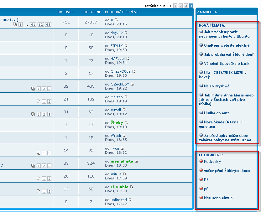 Ale není to jen o přidávání... Pokud si zobrazíte zmiňovanou čtvrtou stránku, můžete si všimnout nového panelu vpravo. Ten nově přináší 10 aktuálních témat na našem dceřiném projektu Maxiforum.cz a 5 posledních fotografií z naší fotogalerie amatérských/polo-profesionálních fotografů. **