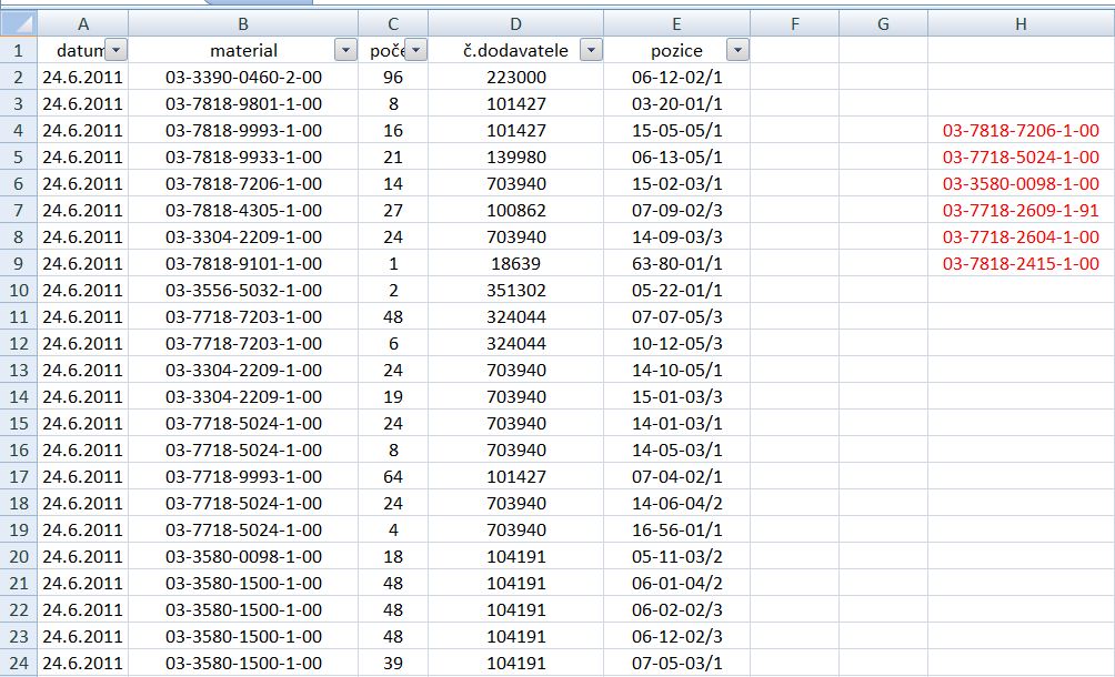 potřeboval bych vyfiltrovat pouze data materiálů z tabulky podle seznamu jednotlivého druhu materiálu který budu mít někde vedle (to jsou ty cervený hodnoty vedle screenu). Jedná se o velkou tabulku s mraky čísel materiálů, ze kterých budu vždycky potřebovat vyfiltrovat několik typů matroše.