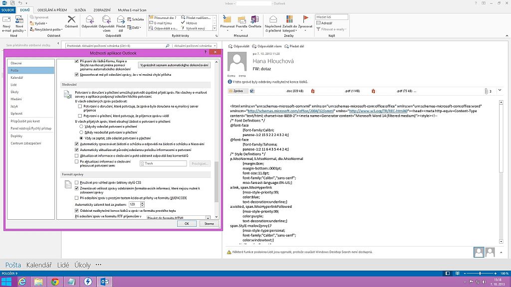 prosím Vás, mám problém s tím, že příchozí e-maily se zobrazují špatně. Ukazuje se mi (hádám html) kód ale tělo zprávy ztraceno v kódu. Dělá se mi to až od office 2013. Do té doby co jsme tu v práci používali office 03 až 10 stejným způsobem - vše bylo ok. Nainstaluji čistou instalaci office 13, připojím si síťový účet, vše funguje ale zprávy se zobrazují takto, i když jsem zkoušel vypínat/zapínat CSS v nastavení zpráv apod. Viz. print screen, prosím poraďte. nemohu nikde dohledat, jak nastavit vzhlednost mailu v příchozích i odchozích tak aby vše vypadalo jak má. Hlavně těch příchozích. Děkuji pěkně