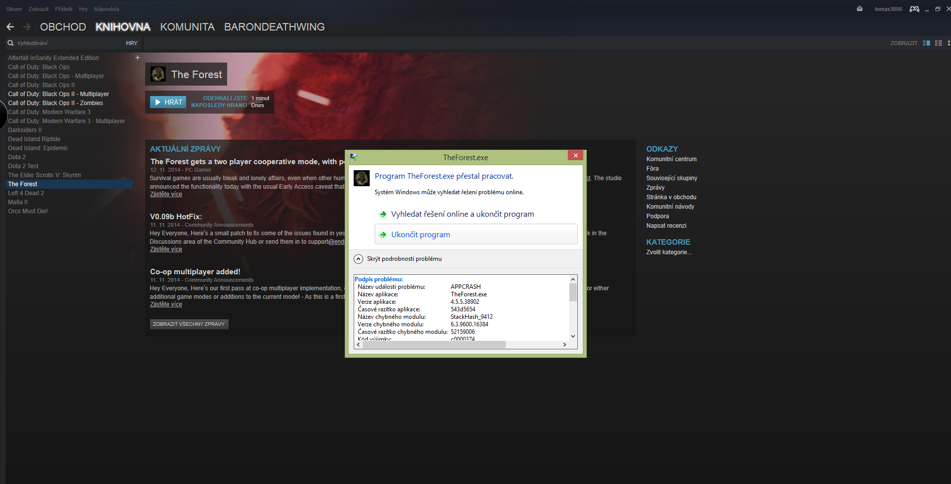 a nebo Program přestal pracovat, u the forest mi tam skáčou 3 chyby----1. chyba Program Přestal pracovat. 2. chyba ten Oops! nevim přesně co to je a pak poslední 3. a k té přidávam screenshot s násvem chyba2