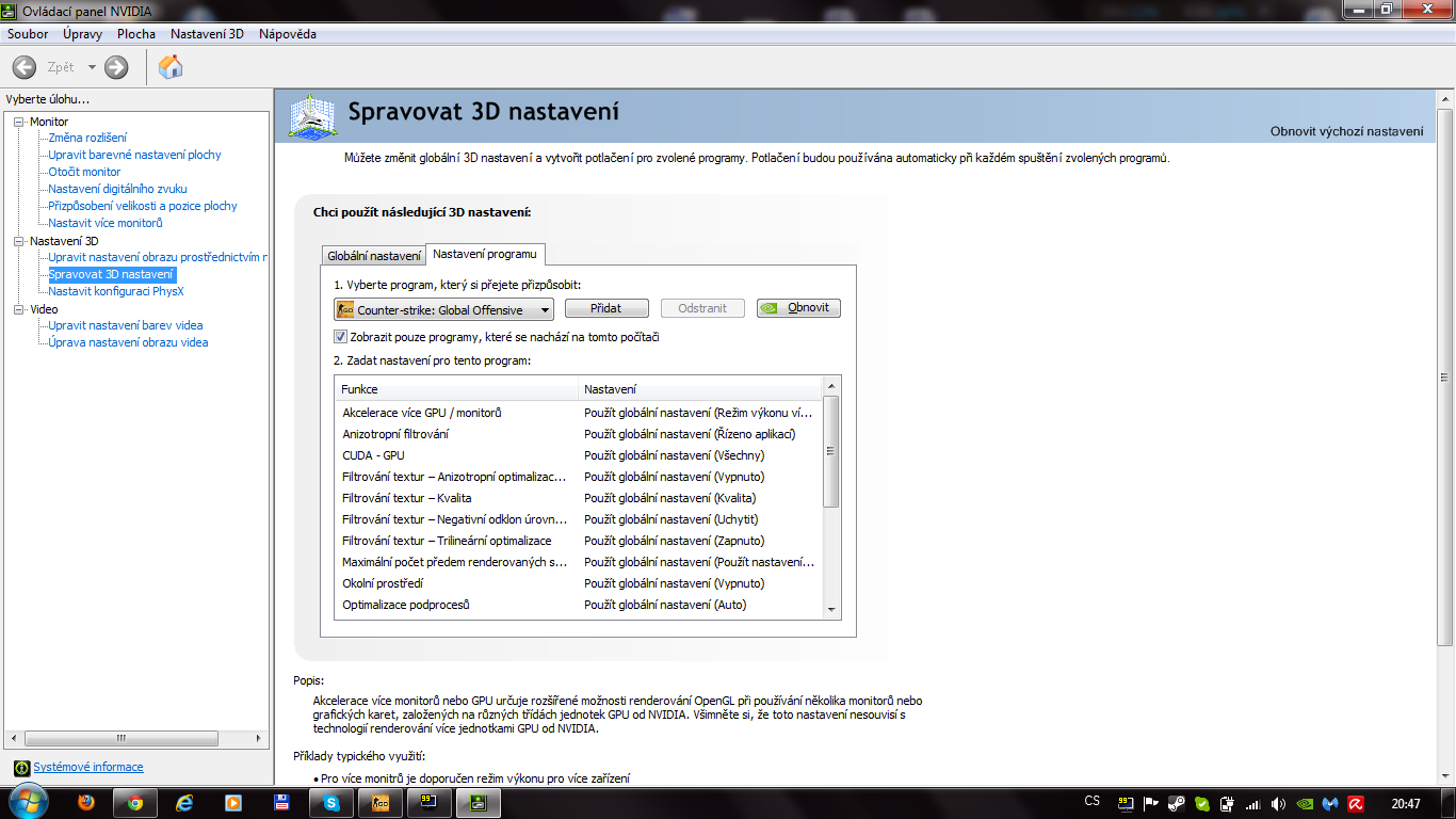 Jak jsme již tady psal, že nastavení grafiky v CS:GO na nejnižší (až na rozlišení) nepomohlo a FPS místama klesají ve hře dál, jsem zkusil nastavit hru a možnosti grafiky v panelu grafiky Nvidia. Na co to přesně je a jak to funguje ? Vybral jsem CS:GO a vypl Vertikální synchronizaci a zkouším, jestli to tomu něco pomohlo, nebo ne... (viz. příloha)