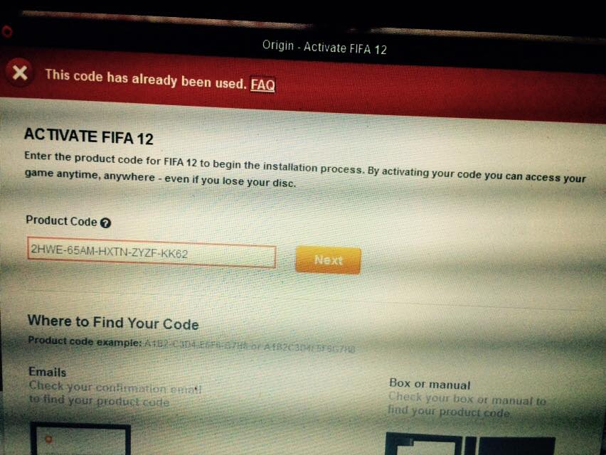 jelikož jsem již nehrál některé hry delší čas - tak jsem je začal prodavat, ale kupce od FIFY 12 mi dnes zaslal reklamaci, že hru nemuze hrat, protože mu Origin nechce povolit instalaci z důvodů již pouzitého kodu. Nevíte co s tím? hru ma již na nic a nebo da se to nějak obejit - jedna se normalně o originalku.