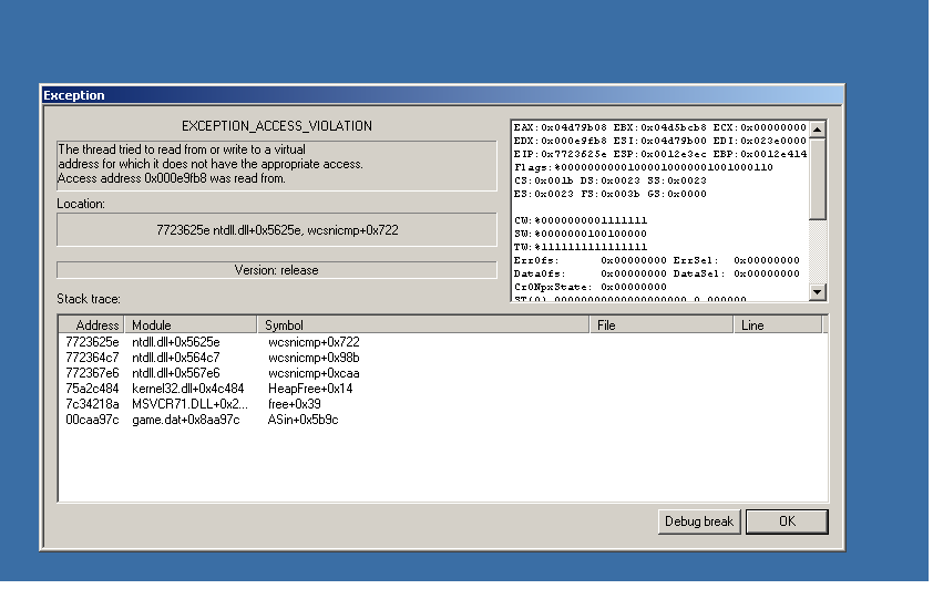 po instalaci hry se hra patchne na verzi 1.02 a potom crackne poté hru spustím a vyskočí mi tabulka "Exception" jsou tam nějaký texty a různá čísla výběr možností je "Ok" a nebo "DebugBreak" nebo něco takovýho pokud dám Ok nic se nestane jen se to vypne a pokud dám to 2 tak mi vyskočí Runtime++ Error nevíte někdo co stím ? jinak muj operační systém je Win7 32bit Sp1 hru jsem již jednou na tomto pc mněl a šla v pořádku nevím proč mi ted nejde doporučené požadavky hry splnuji budu rád za jakékoliv rady zatím.