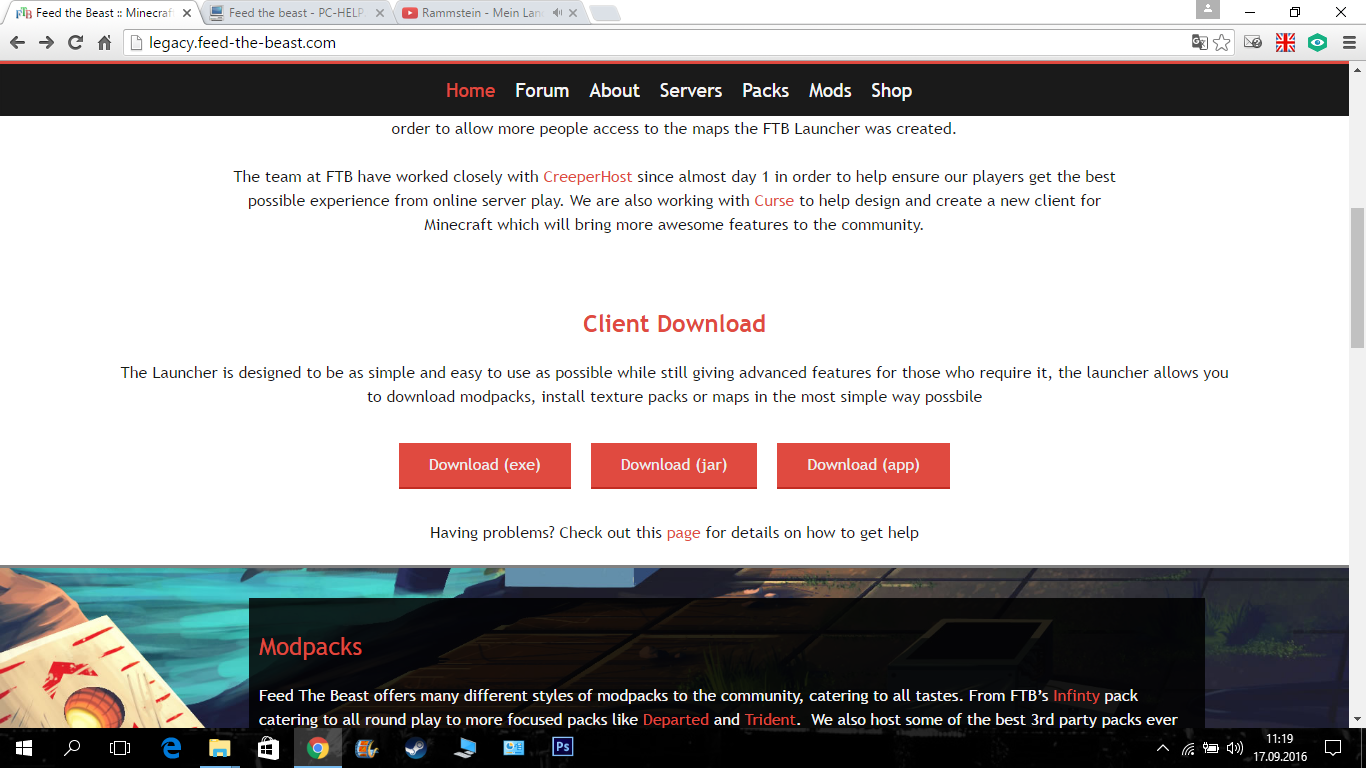 Zde stáhnu soubor .exe který by měl rozjíždět launcher, ten by se mě zeptat kam chci ukládat modpacky, ale nerozjíždí