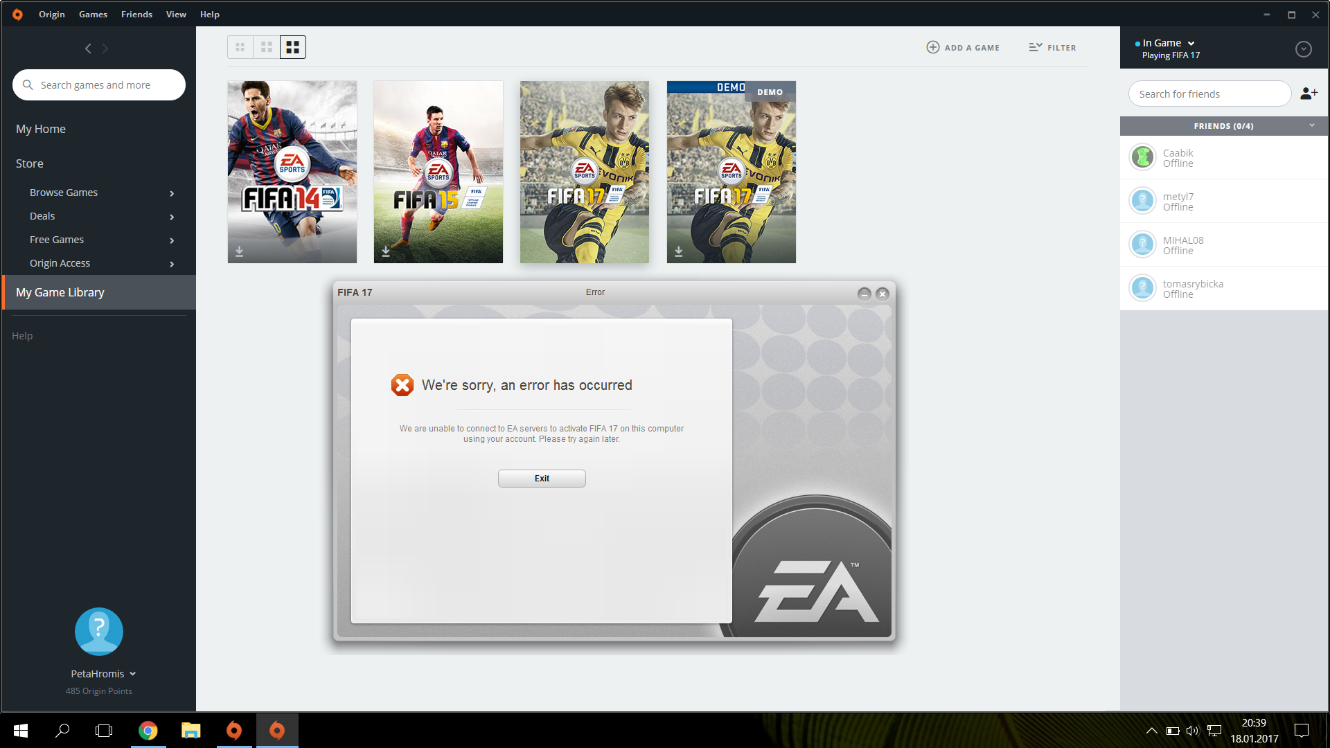Zdravím všechny, kteří by mi mohli pomoct. asi pul roku hraju Fifu 17 bez problému a najednou po pondělním updatu když zapnu fifu tak mi to napíše tenhle error a nespustí mi jí to. Zkusil jsem vratít PC o tyden do předu, reinstalnout fifu i origin, ale nic nepomohlo. Takže jestli mi někdo poradí a půjde to tak budu neskutečně vděčnej, já si opravdu nevím rady :cry: