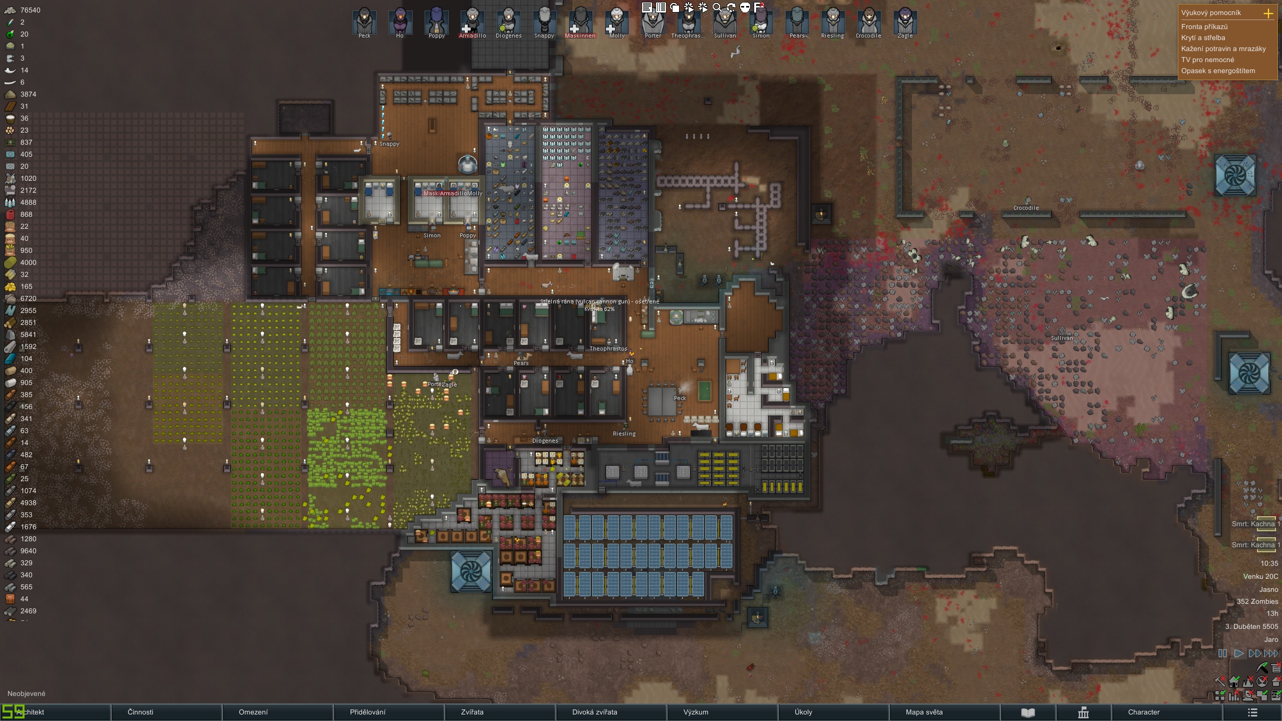 Posílám screenshot kolonie, vedení klimatizace a seznam módu (jestli jsou ještě všechny aktuální, protože jsem to tam dával před cca rokem), které dle mého o dost zlepší hru, ale neudělají ji jednodušší tak, aby to bylo jako cheaty. Samozřejmě třeba zombie mod tam mám proto, protože s takovou kolonií mě už nic moc nepřekvapí, ale když k útočícím broukům a frakcím přidáš 300 zombie, to už jo.