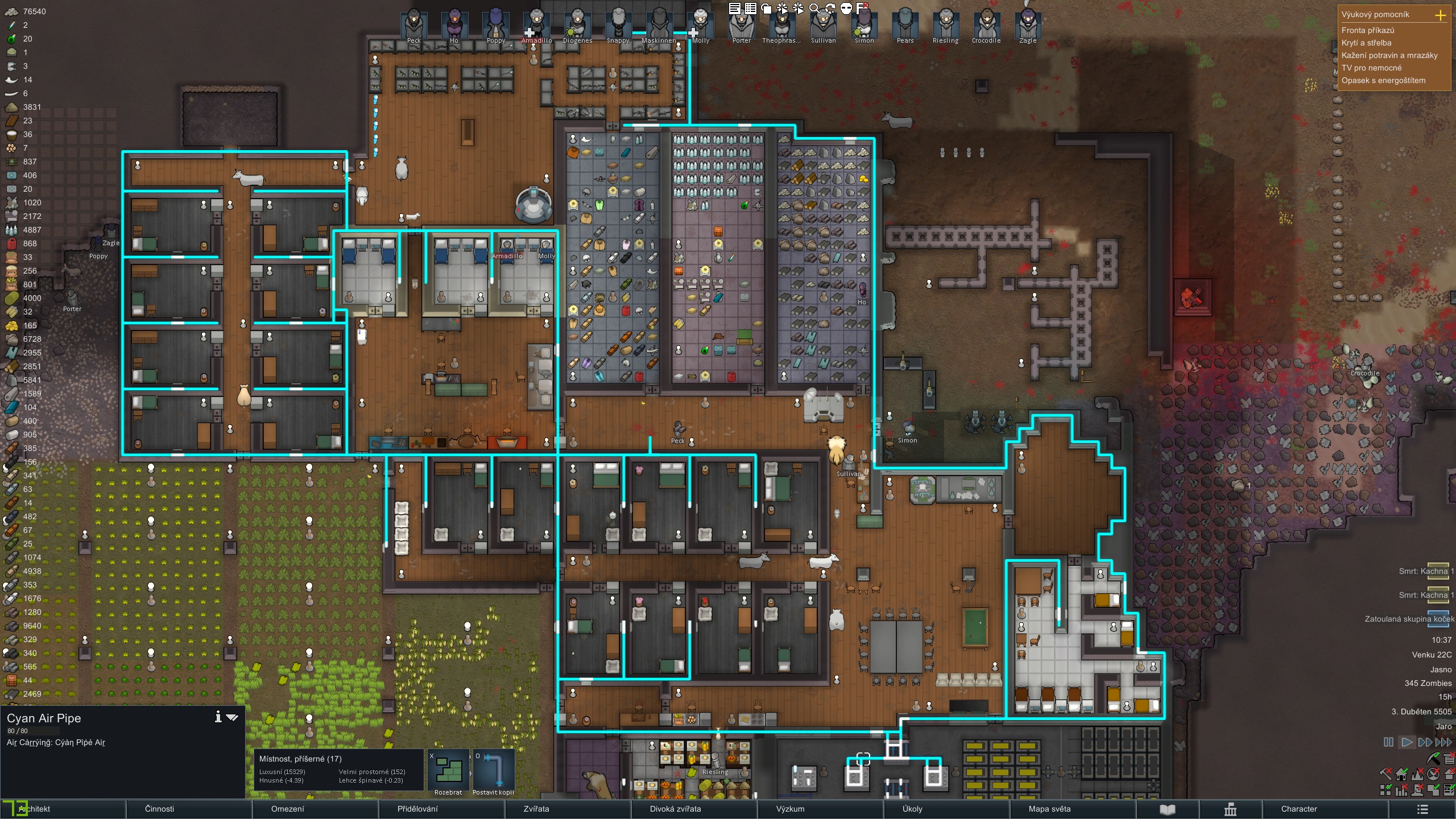 Teplotu já řídím tak, že všechny místnosti jsou propojené ventilačními mřížkami a okrajové místnosti mají na okrajové zdi klimatizaci spojenou s venkem. Doporučuju mód centralized climate (trubky ve zdech a jen výdechy do místností s regulací teploty každého vedení), který jsem hned nainstaloval, protože řešit to takto bylo k ničemu na větší kolonii. Funguje to jako v reálu. Bílé body u vedení jsou výdechy ventilace, mám tam modrý a červený okruh. Červený byl tuším pro mrazáky. Dobré je rozdělit - mrtvoly k naporcování, suroviny, hotová jídla.