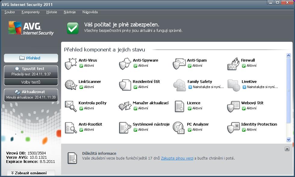 AVG má evidentně v nějakým balíku, jelikož spyware štít není běžnou součástí free verze samotného antiviru. V plný verzi, kde je spyware štít, tak je také součástí i zmiňovaný firewall a další komponenty. Viz příloha.To je pěkné, že jsi odinstaloval antivir a vypl spyware štít, já se ale ptal na firewall