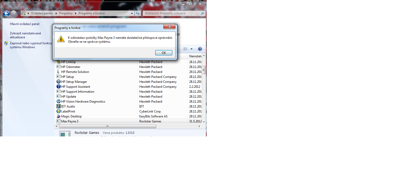 Nejde mi odinstalovat Max Payne 3. Dostalo se mi do ruky DVD s touto hrou. Vypadalo jako originál, ale hra byla koupena na ukrajině. Kámoš říkal, že to je origo, ale samozřejmě hra nešla. A teď se ji nemůžu zbavit. Nevíte jak ji odstranit? Na HDD nemůžu bůbec najit složku Rockstar Games ani Max Payne 3. Díky za pomoc
