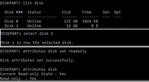 Spustit diskpat, zvolit disk. Nastavit atribut read-only. Osobně jsem nezkoušel, ale mělo by to fungovat.