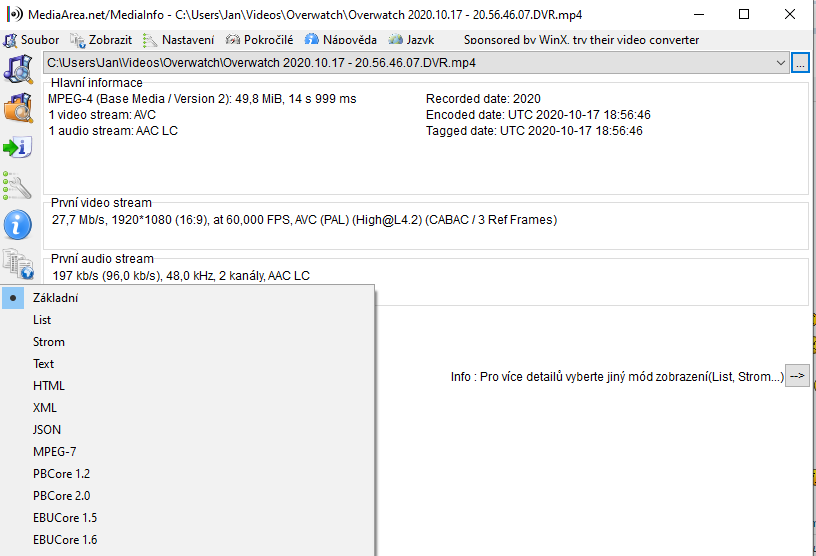Po stáhnutí aplikace MediaInfo vyberete daný soubor a na levé straně kliknete na takové 3 papírky s modrou ikonkou -> Ikona zobrazit. Tam nastavíte Strom / Tree (Viz obrázek)
