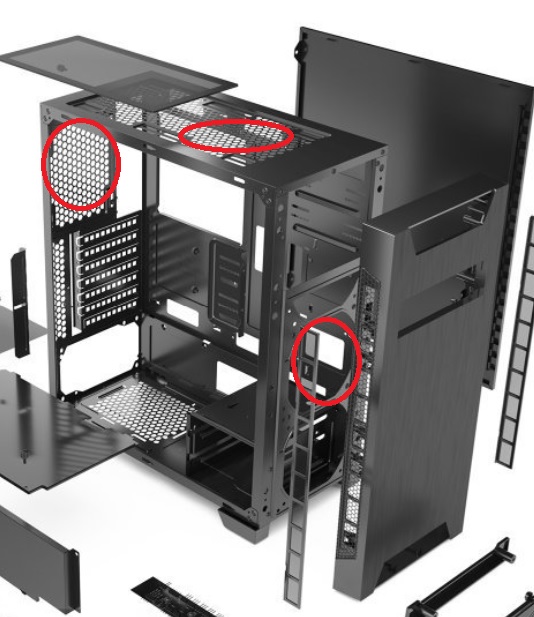 Pokud máš case Silentium PC Armis,tak osaď ventilátory tam jak jsem ti zakroužkoval červeně. Přední nasává a horní a zadní vyfukuje.
