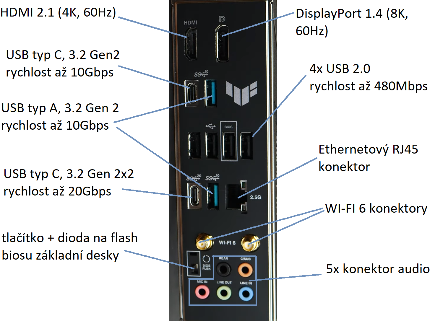 IO shield je dostatečně vybavený. Nechybí moderní porty typu USB C, USB typu A je dostatek. Ethernet konektor je dnes samozřejmostí. Příprava pro Wifi antény je v této příplatkové verzi. Asus rovněž prodává tuto desky i bez Wifi pokud tedy wifi nepotřebujete můžete zakoupit Asus TUF Gaming B650 Plus.