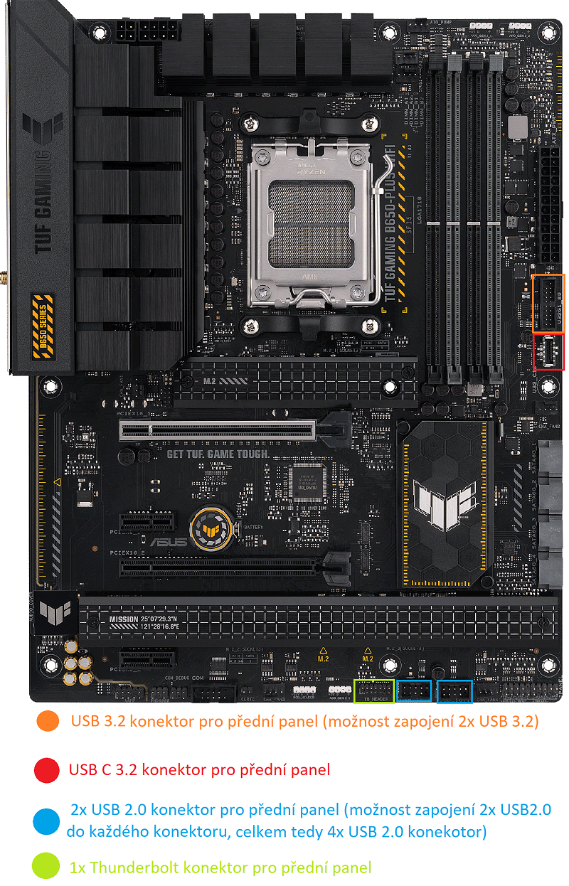 USB portů pro přední panel má základní deska dostatek. Najdeme na ní dokonce i thunderbolt port.