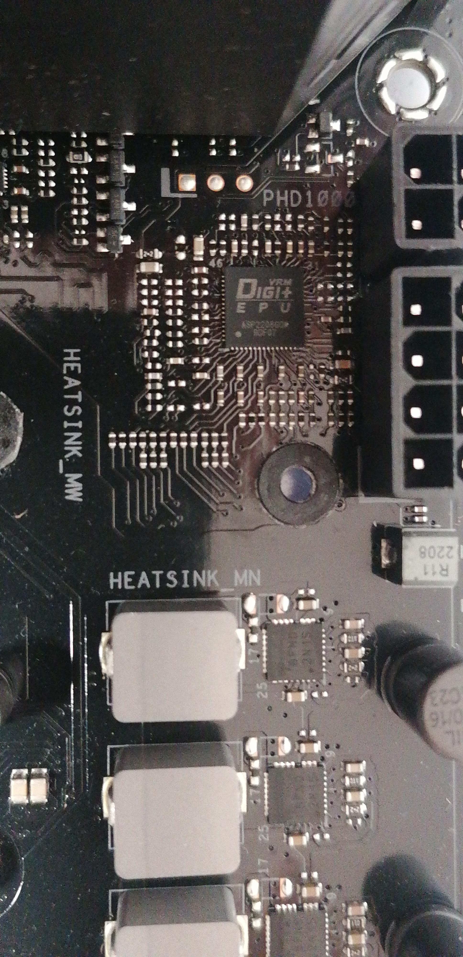 Osmipinový konektor totiž dokáže přenést až 300W. Z procesorového 8 pinu a 4 pinu jde napětí do digitálního kontroléru DIGI+ VRM EPU označovaného jako ASP2208GQW.