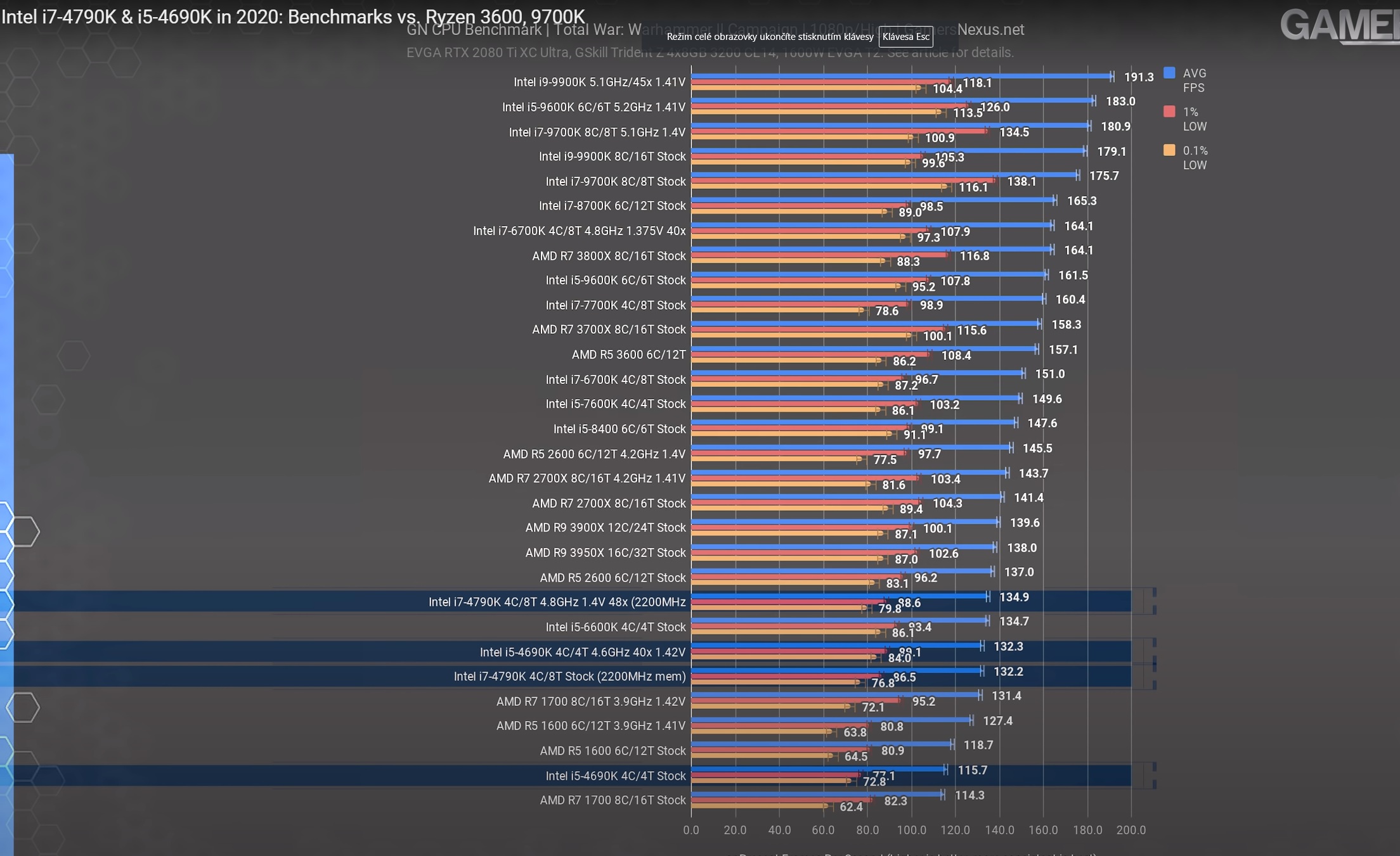 Stačí se podívat na recenzi historického 4690k https://www.youtube.com/watch?v=D6RsDyM ... 6RsDyMn2gY třeba vás to AMD fany probere :) Kdyby ne, podíval bych se na horní příčky, žádné AMD tam ve hrách nevidím.