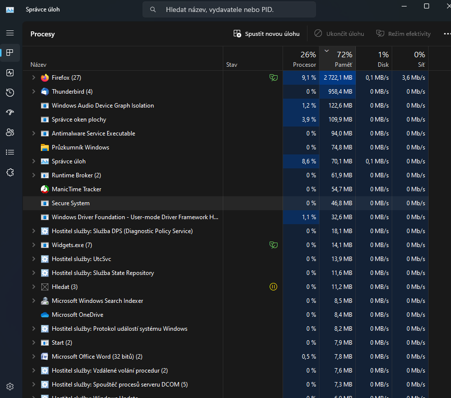 U mě mám trvale 15 Gb z 16 GB využito i přestože správce úloh ukažuje čerpání tak 4 GB jenom to mi 10 GB žere systém? Spíše to ten Windows ukazuje jako všechnu obsazenou pamět a vůbec neřeší, že z těch 15 GB, které ukazuje obsazené je jí 11 GB k uvolnění (použití), jinými slovy je skoro volná.