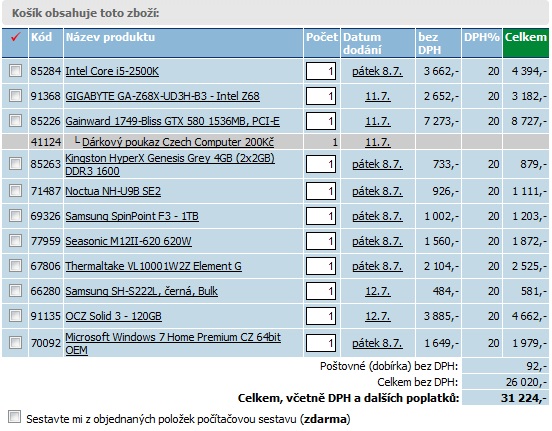Jen tak pro tvou informaci. Jestli chceš ušetřit těch 9 stovek za sestavení, kup si to u czc.cz (tam je sestavení zdarma), akorát nevím, jak je to s cenou ostatních komponentů.