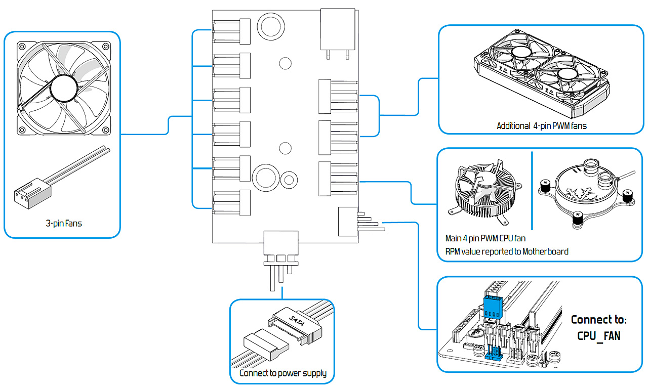 Pro funkci regulátoru je třeba jej napojit přichystaným 4pinovým řídícím kabelem na konektor CPU_FAN základní desky a pomocí SATA napájecího kabelu do něj přivést napájení ze zdroje.