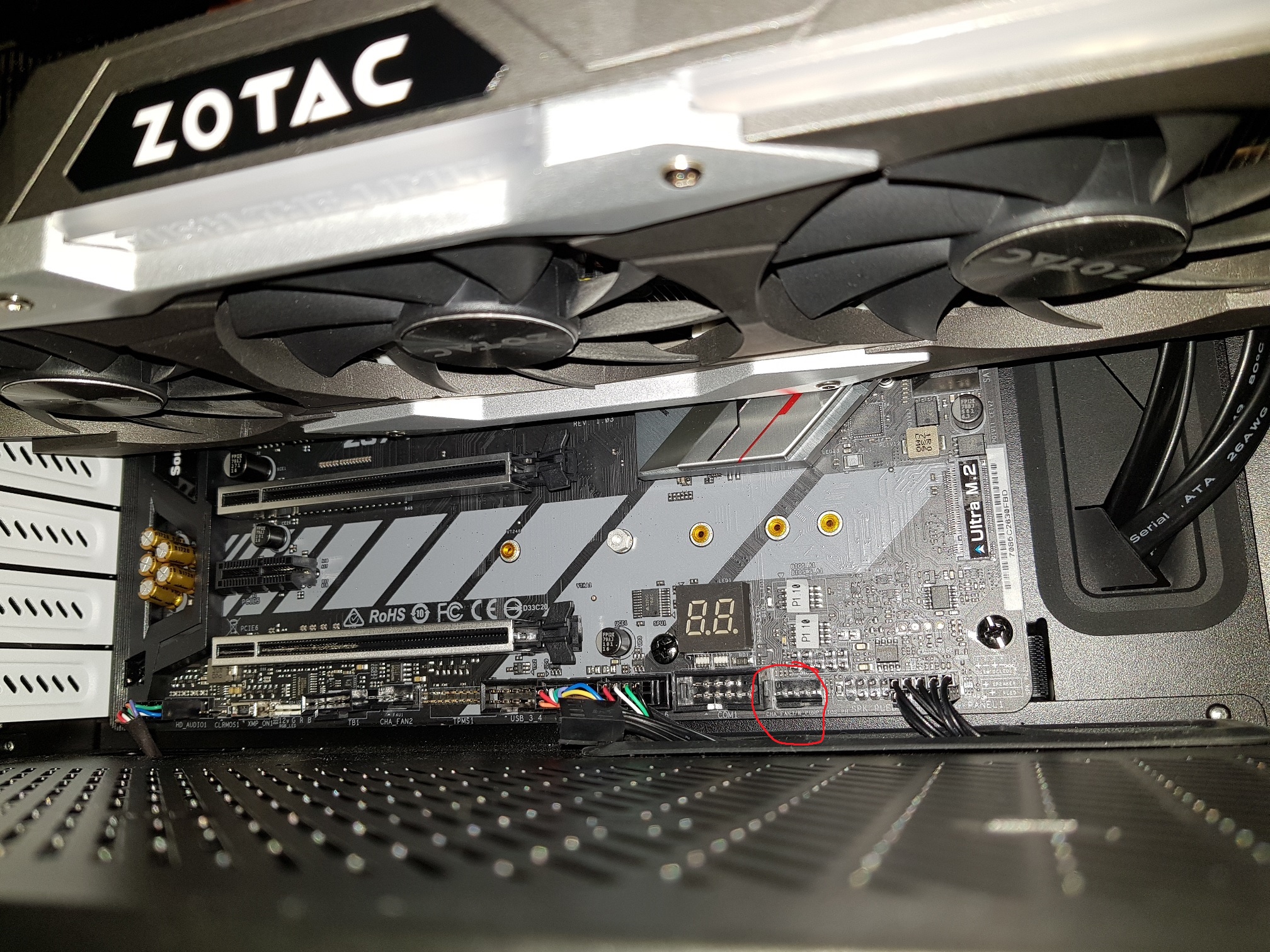 Jo a už jsem chtěl psát, že CPU_FAN nikde nevidím ačkoliv v biosu je a někde tam prostě musí být, hledal jsem kolem CPU, ale až teď jsem si toho konečně všiml, je to schovaný nahoře zatím Z370 krytem: