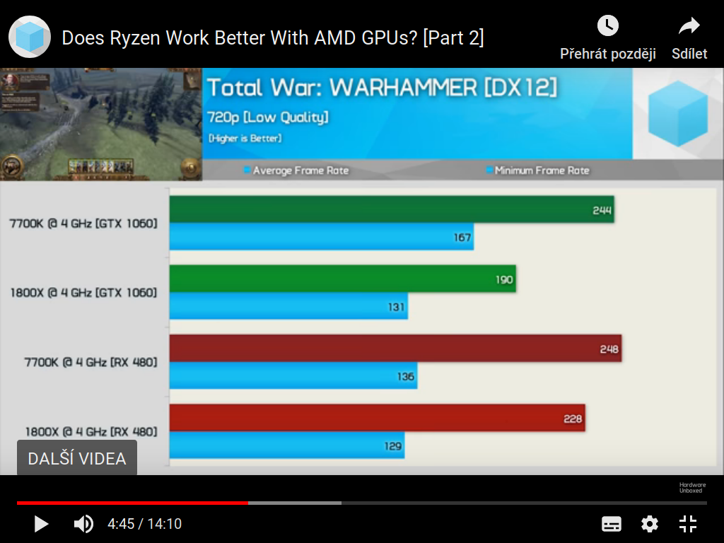 Tak jsem ti vystříhnul screen z tvého videa a zkusím to zopakovat. Na screenu vidíš, že obě karty mají s intelem porovnatelný výkon, ale jakmile se dají k AMD, tak nvidia najednou ztratí 54FPS a AMD karta jen 20FPS. Je ta hra optimalizovaná pro nvidiu nebo pro AMD podle tebe, když mají karty s intelem skoro stejný výsledek?