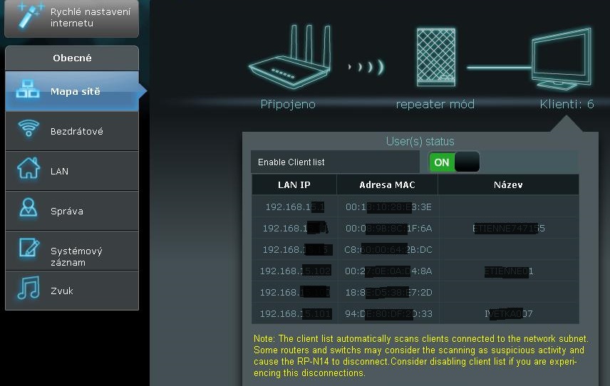 Další vychytávka, která se mi opravdu líbí je Mapa sítě. Zde uvidíte nejen připojená WiFi zařízení, ale veškerá zařízení, která v síti jsou, včetně jejich MAC adres. Velice dobrá pomůcka při hledání případných problémů.