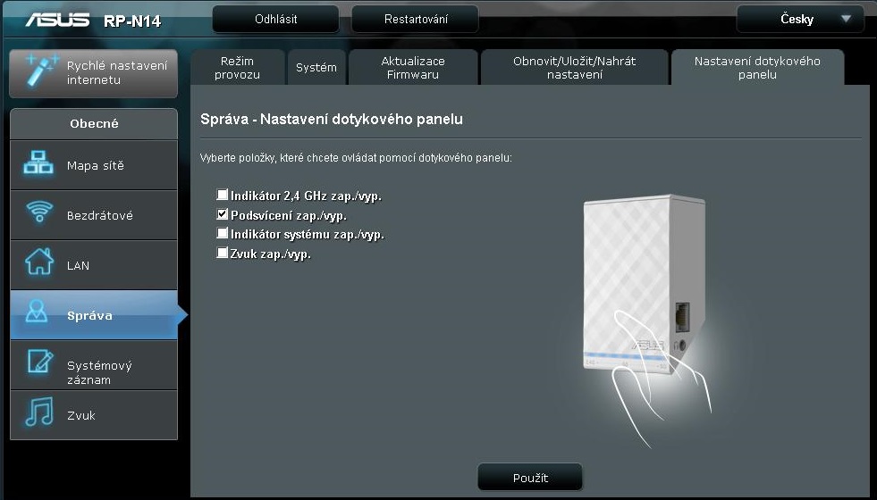 - osvětlení, pokud byste chtěli repeater použít jako noční lampičku. Dotyková ploška umožňuje více nastavení, kromě zapínání světla např. zapínání/vypínání rádia, či indikačních LED.
