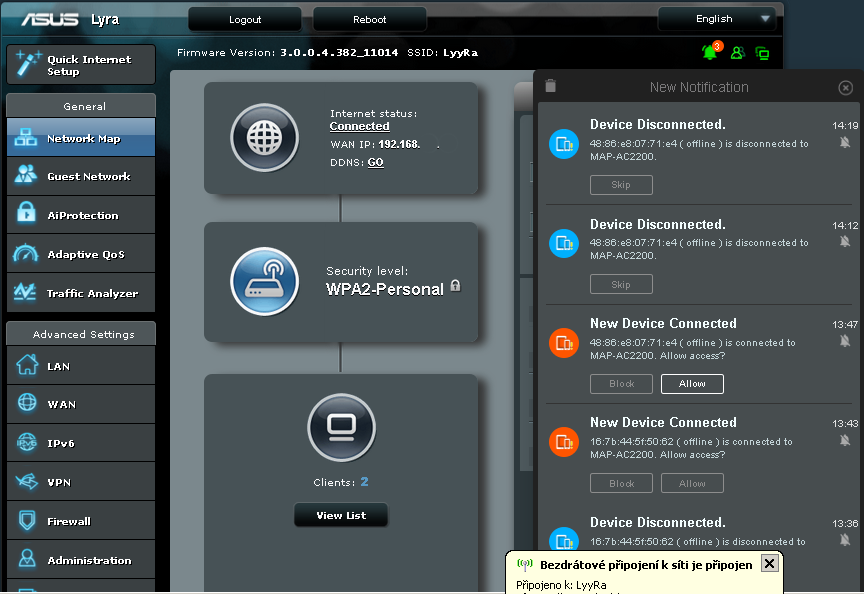A pokud by vám toto jednoduché nastavení nestačilo, pak lze Lyru konfigurovat i ručně. Samotné grafické rozhraní je velice podobné rozhraním, jež znáte z Asus routerů. Nicméně tentokrát na češtinu zapomeňte. Úvodní strana ukazuje počet připojených klientů, stav, hlášení o připojovaných bodech atd.