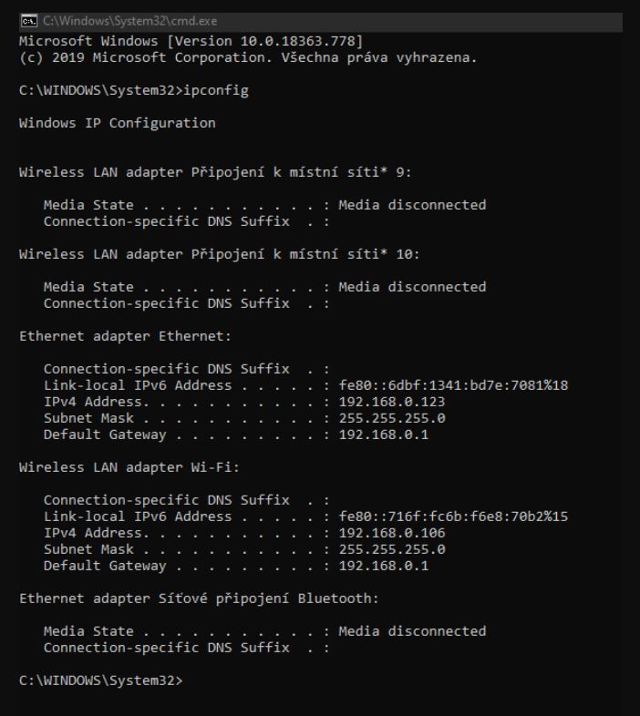 Ethernet adapter Síťové připojení Bluetooth: