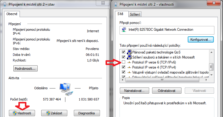 3. Pokud ani poté síť nebude fungovat, pak zkus odebrat protokol IPv6 (obrázek).