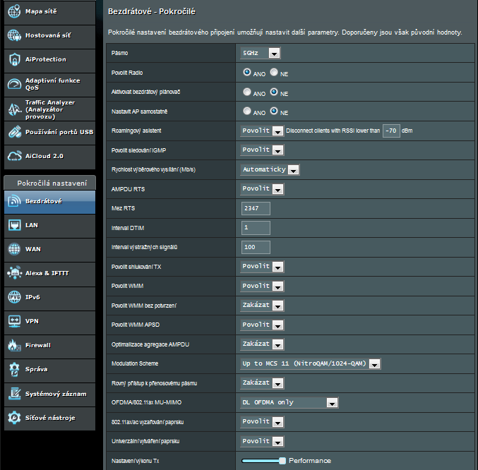 - WiFi6 režim (802.11ax) - rozhodně zapněte, pokud máte kompatibilní zařízení