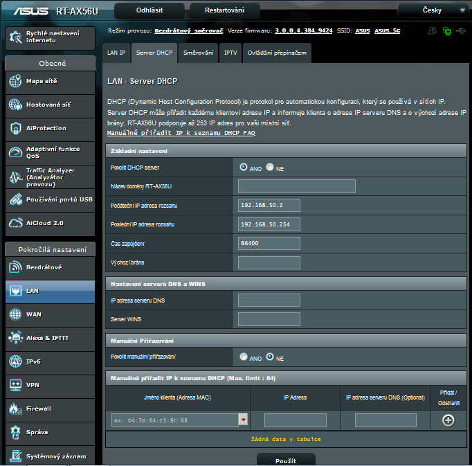 LAN Základní nastavení IP adresace, možnost nastavení ručního směrování, možnost nastavení VLAN pro IPTV. Položka "Ovládání přepínačem" je anglicky lépe znějící "switch control" a umožňuje například povolení vělkých rámců (jumbo frame), což může zvýšit propustnost vaší interní sítě. A nechybí možnost nastavení DHCP (automatické přidělování IP adres). A zde je i volba pro manuální přiřazení určité IP adresy pro určitou MAC adresu. Tak lze zařídit, že např. vaši TV najdete vždy na stejné IP adrese v síti.