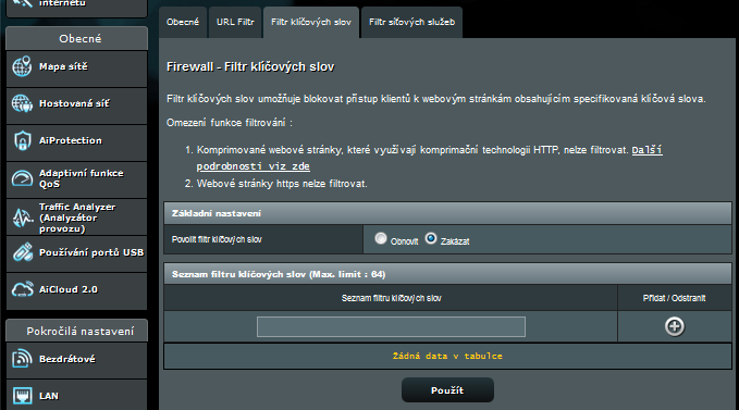 Firewall doporučuji povolit. Zároveň se router umí bránít DoS útokům, můžete zde zakázat ping na WAN port (tedy ping z internetu) a zapnout logování firewalluURL filtr - funguje jako blacklist, nebo whitelist. Pokud zadáte URL do blacklistu, stránky se nezobrazí. Pokud do whitelistu, zobrazí se pouze povolené stránky.Keywords blokuje stránky na základě toho, zda obsahují klíčová slova zde zadaná. Nefunguje pro https.Síťové služby zakazuje/povoluje pakety pouze pro určité služby.