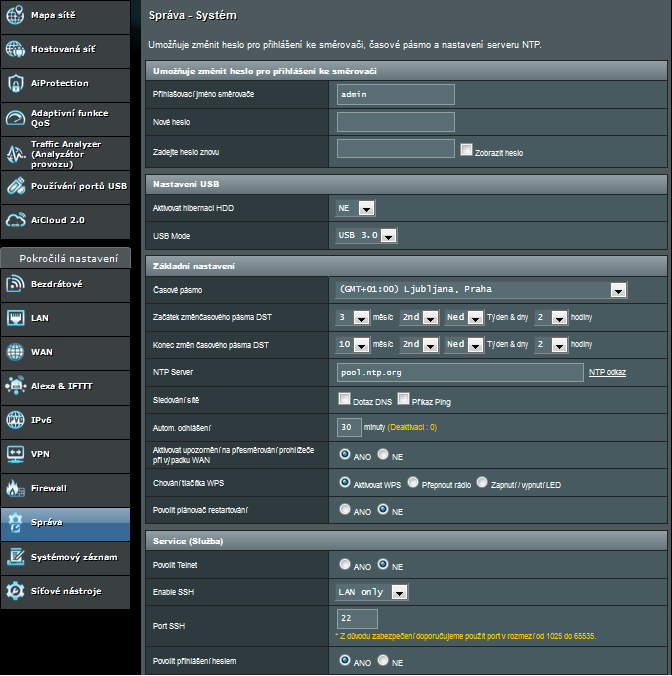 Sytém obsahuje nastavení hesla k routeru, můžete nastavit hibernaci připojeného externího disku, režim USB portu, časové pásmo a server pro synchronizaci času, chování WPS tlačítka, Telnet (nedoporučuji), SSH připojení a odkud, povolit přihlášení přes zabezpečený protokol https, zakázat správu serveru z internetu (WAN) - doporučuji a správu routeru pouze ze zadaných IP adres.Aktualizace firmwaru - router si sám zjistí, zda pro něj neexistuje novější firmware, popřípadě můžete aktualizovat ručně.