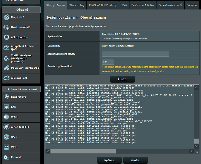 Obecný záznam - informace o spuštěných službách a startu routeruWireless log - zde najdete odpověď na zde často kladenou otázku: "jak zjistím, zda se k mé WiFi někdo nepřipojil?" Odpověď najdete v tomto logu.Přidělené DHCP adresy - seznam všech připojených zařízení, které obdržely IP adresu od DHCP routeru.Připojení - historie aktivních připojení. Zde najdete z jakoými IP adresami a na jakých portech jste komunikovali.