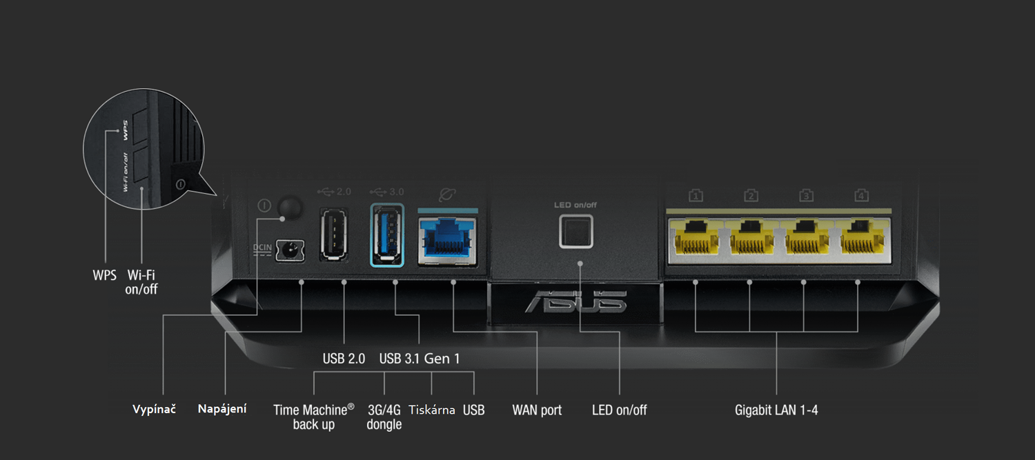 Asus mírně pozměnil design a router tak vypadá mírně agresivněji, než jeho "obyčejní" kolegové. Disponuje trojicí odnímatelných antén. Zadní stěna je obsazena čtyřmi porty LAN, jedním WAN a dvěma USB porty, z nichž jeden je USB 3.0. Dále je zde vypínač, zdířka pro připojení napájení a tlačítko, kterým lze vypnout/zapnout signalizační LED a konečně i reset pro tovární nastavení. Tlačítka pro WPS a pro vypnutí WiFi jsou na boku routeru. K indikaci jsou použity bílé LED - nepřipojený WAN port je signalizován červeně. LED nesvítí nijak rušivě.