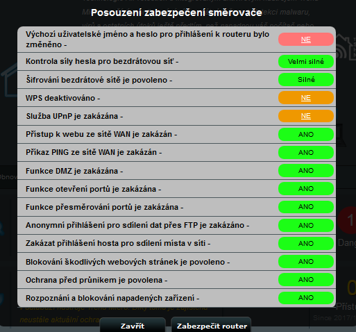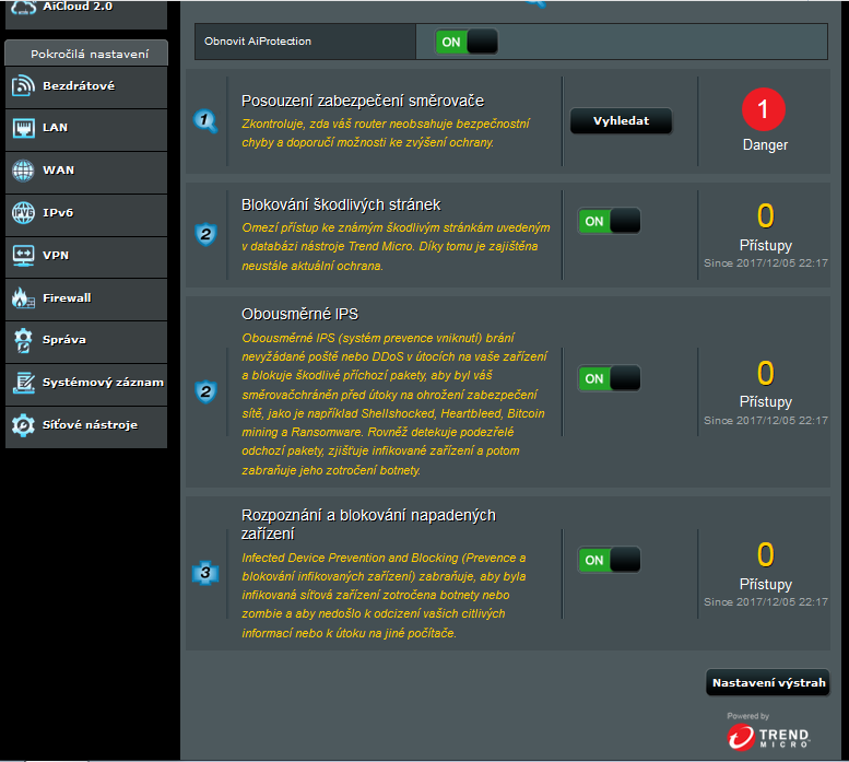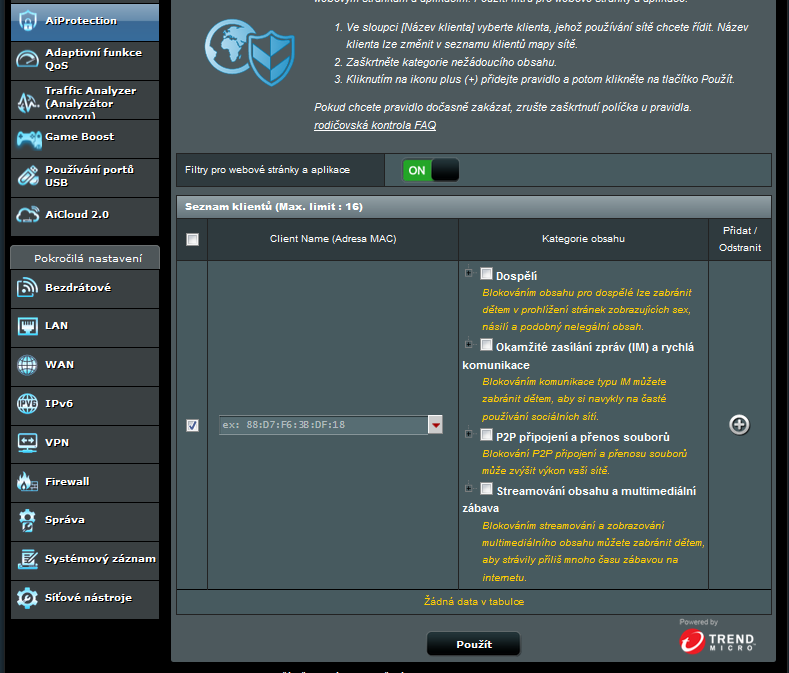 Bezpečnost: Zde Asus musím pochválit. Nastavení bezpečnosti se skrývá pod záložkou AiProtection a Asusu používá produktů TrendMicro. Všechna nastavení jsou srozumitelně vysvětlena.Pro uživatele, kteří si nejsou úplně jisti slouží jednoduchá kontrola. Navíc umí filtrovat web podle obsahu - samozřejmě, že lze nastavit omezení na stránky ve firewallu, ale tohle je pro uživatele jednodušší řešení.