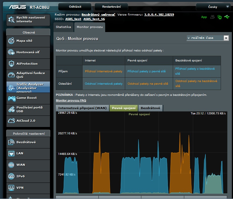 Router jsem podrobil i základním testům. Na WAN stolní PC SSD disk, na LAN notebook SSD disk, oba 1Gbit ethernet. Jako Flashdisk použit Corsair 64GB, USB 3.0. Vzdálenosti A-1m od routeru, B-6m od routeru jedna železobetonová zeď, C-10m od routeru 3 železobetonové zdi. Testováno v reálných podmínkách v panelákovém bytě. V okolí 23 WiFi sítí, z toho jedna na 5GHz. V notebooku síťová karta 802.11n. WiFi testována i na kartě https://www.asus.com/cz/Networking/PCEAC68/ . Rychlost měřena kopírováním velkého souboru a odečtena z totalcommanderu. Jde tedy o skutečnou reálnou rychlost (Mbps). Zajímavé je, že v pásmu 2,4 GHz je rychlost nižší, když je router blíže síťové kartě, zřejmě se na delší vzdálenost uplatní technologie beamformingu. Dále jsem při testování zjistil, že pokud je aktivována veškerá ochrana (AiProtection), pak je rychlost přenosu souboru z flashdisku asi poloviční. Na síťový provoz WAN/LAN nastavení ochrany nemá žádný vliv.