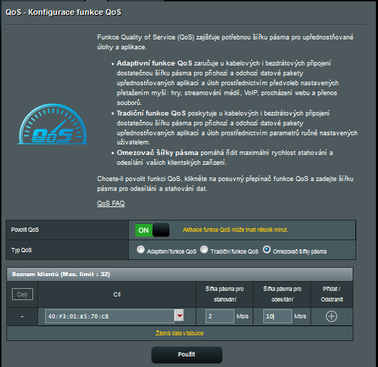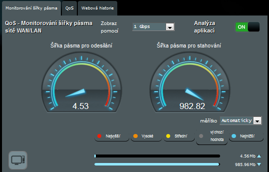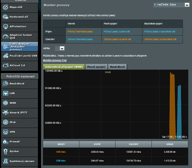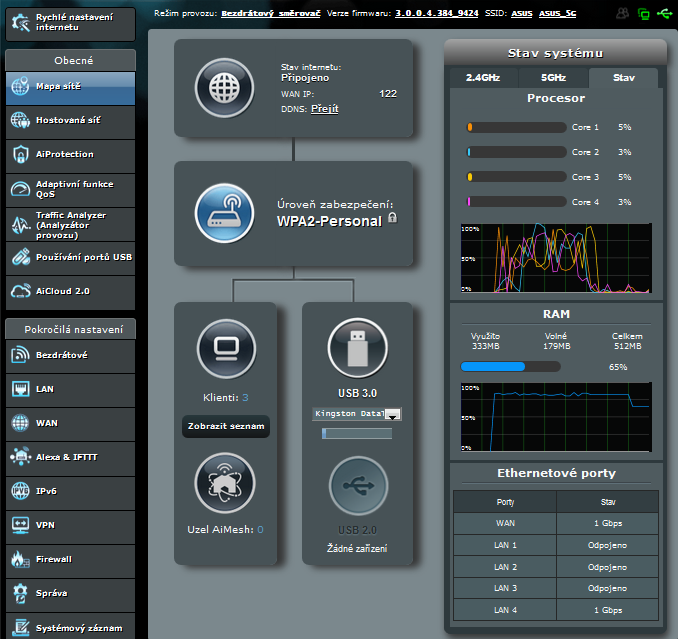 Nastavení routeru je jednoduché, jak už to tak u asusu bývá. Po připojení routeru postačí do prohlížeče zadat router.asus.com a dostanete se do rychlého průvodce, který vás provede základním nastavením. Kladně hodnotím, že jste nejdříve nuceni změnit heslo pro přístup do routeru, poté i heslo pro nastavení přístupu k WiFi. A po proběhnutí nastavení vás už uvítá klasická obrazovka (zde jsem router zatížil přenosem dat, aby bylo něco vidět v grafu):