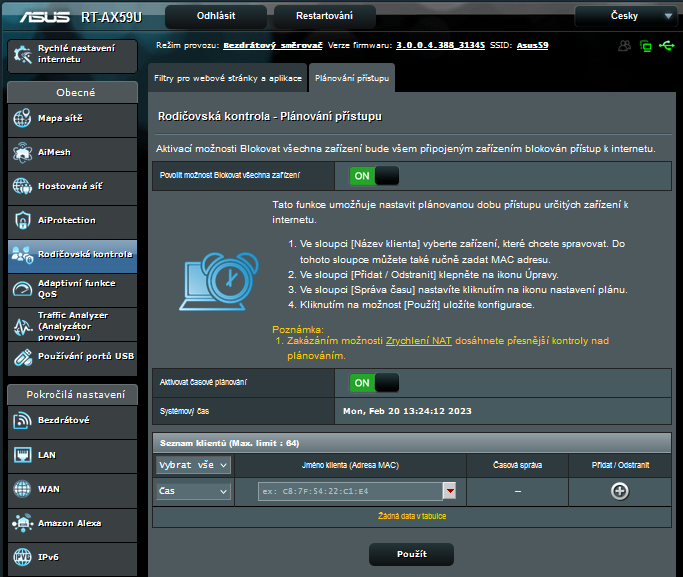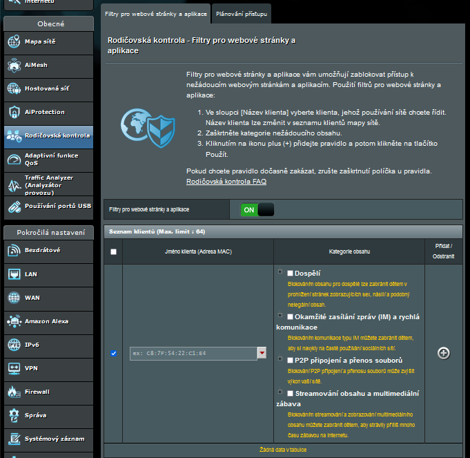 Rodičovská kontrola - zde můžete nastavit omezení pro vaše ratolesti. A to nejen pro stránky s obsahem pro dospělé, ale i omezení komunikátorů, P2P připojení a multimedia. Nastavení je vázáno na MAC adresu (fyzická adresa síťové karty), kterou není tak jednoduché změnit, případně u některých zařízení změnit vůbec nejde.A nechybí ani možnost časového omezení přístupu k internetu.
