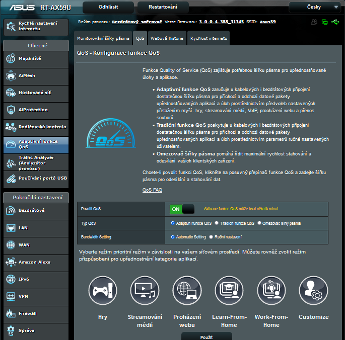 QoS - služba, jež zajišťuje přednostní doručování paketů. Oproti minulým zde přibyly možnosti "učení z domu" a "práce z domu" - pravděpodobně díky covidu. Pro ty, kdo chtějí omezit rychlost (šířku pásma), toto nastavení nejdete rovněž zde.A chcete-li vidět aktuální vytížení, stačí přejít na záložku monitoringu: